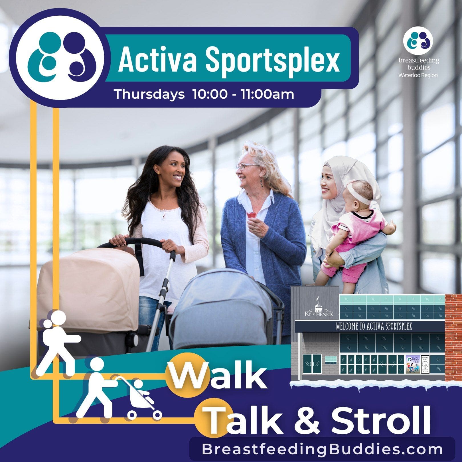 Breastfeeding Buddies and The Health Wellness Team at Community Healthcaring KW are partnering to bring the first ever, Indoor Intergenerational All Ages and All Abilities Walk, Talk And Stroll to Kitchener/Waterloo/Cambridge residents.  Everyone is Welcome.